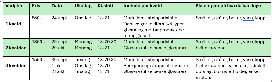 Alle priser er oppgitt per person/kursdeltager. Inkludert i kursprisen er alt av materialer, utstyr, glasurer og brenninger.